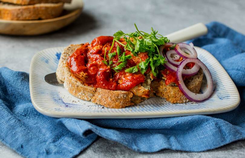 Makrell i tomat og rødløk på mors grovbrød