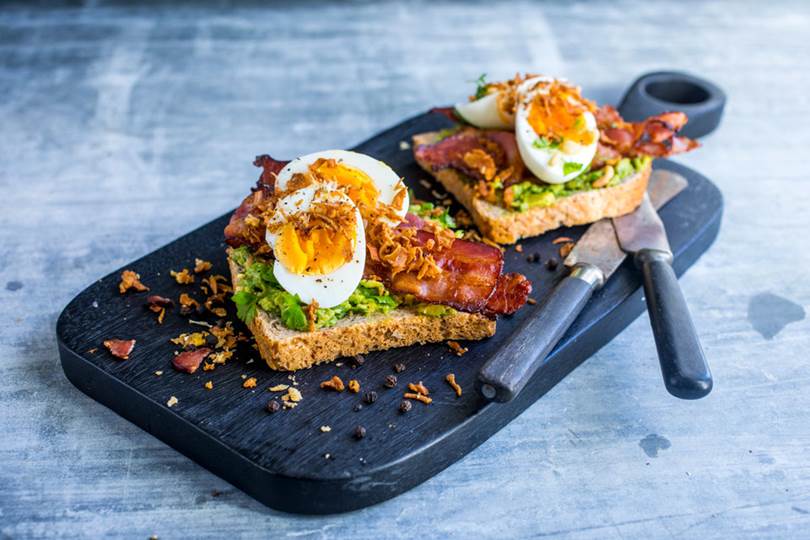 Havrebrød med egg, bacon, avokado, pinjekjerner og urter