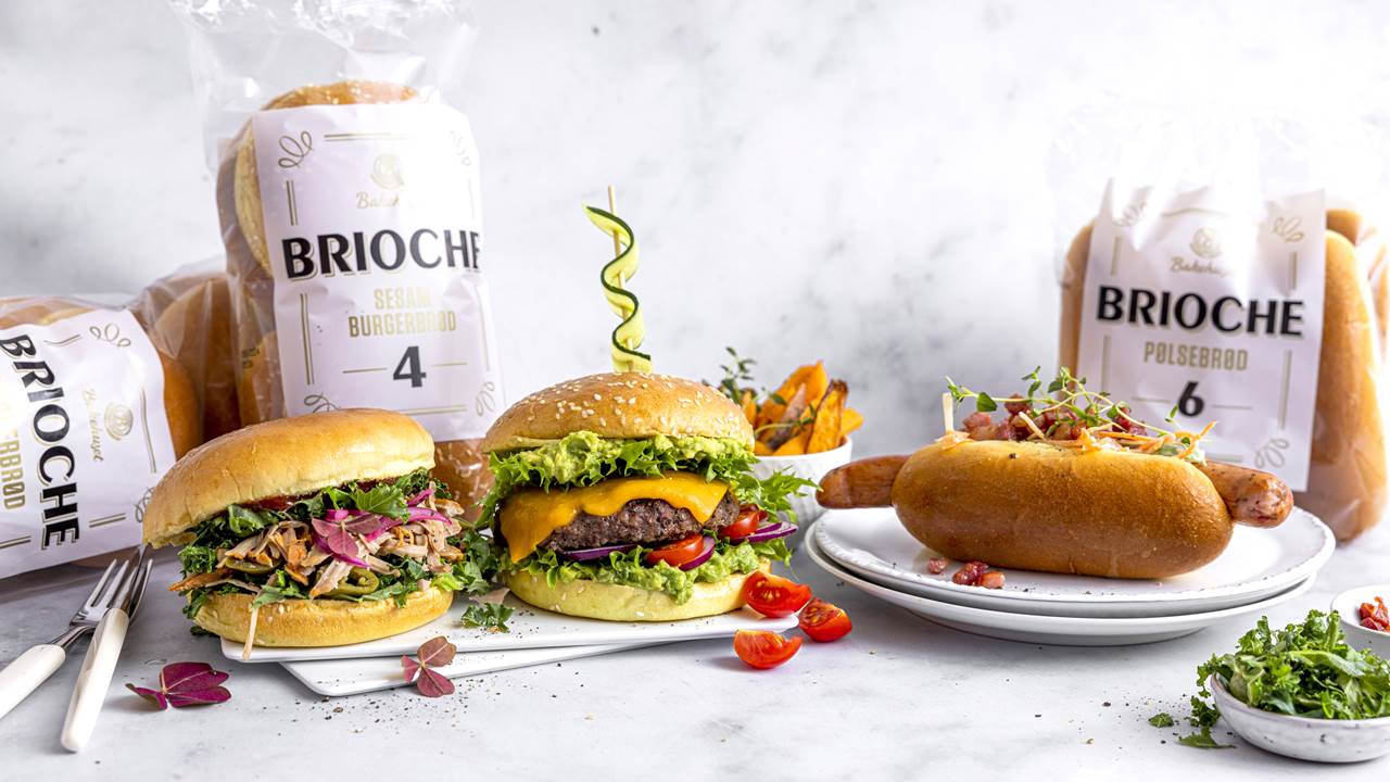 Konseptet består av to ulike varianter med Brioche burgerbrød, en 4pk med sesamfrø og en 6pk uten topping, - og Brioche pølsebrød 6pk.