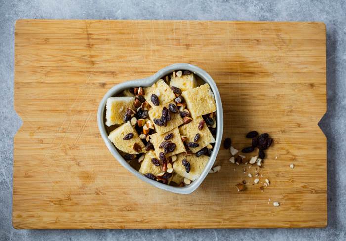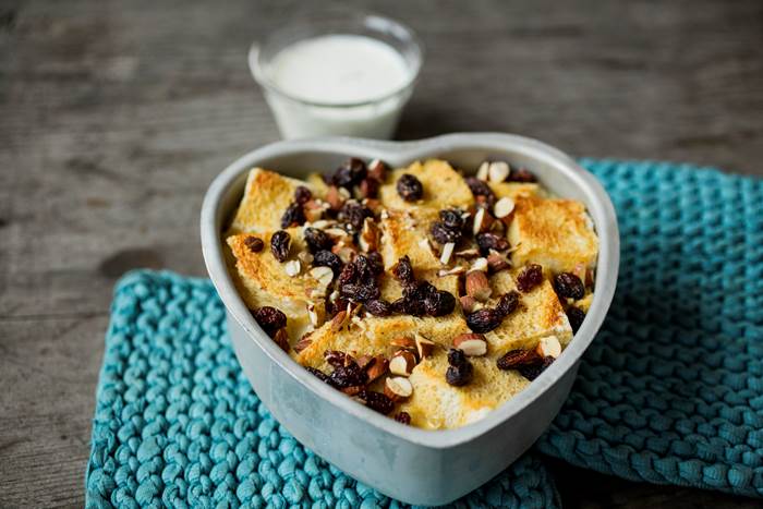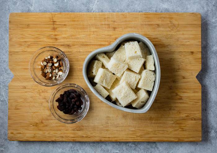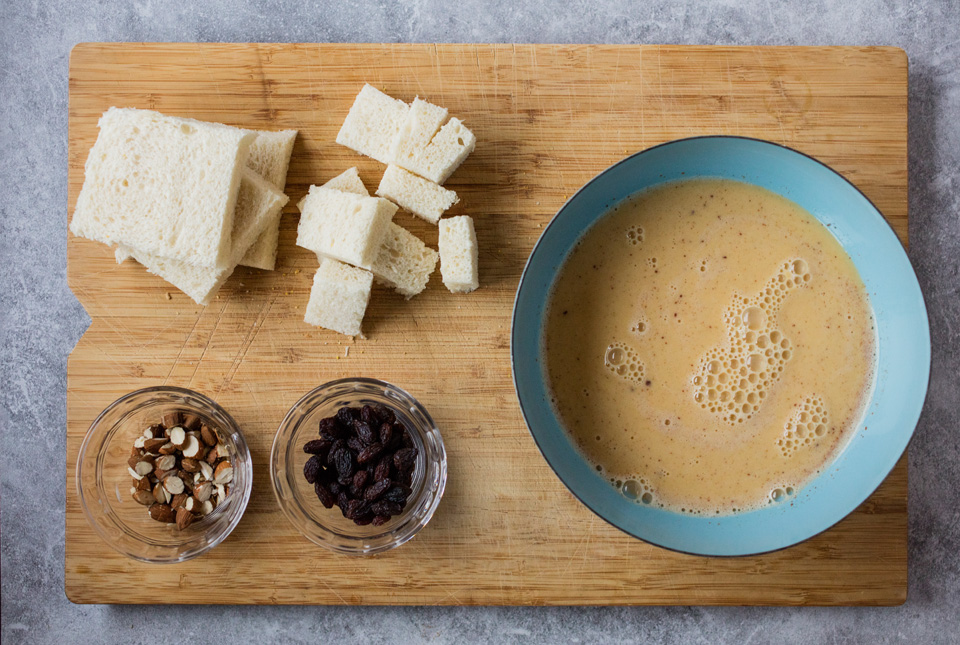 - Hell blandingen over brødet og la det stå og trekke i 30 min. Hell over mer melk om det virker tørt. Dryss over resten av mandlene og rosinenen.