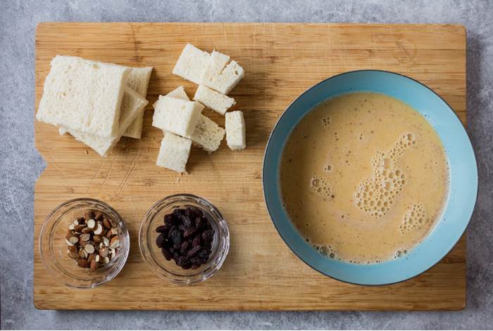 Skjær skorpene av skivene og del dem opp i biter. Pisk sammen egg, melk, sukker og kanel. Tilsett frøene fra vaniljestangen og mesteparten av mandlene og rosinene.