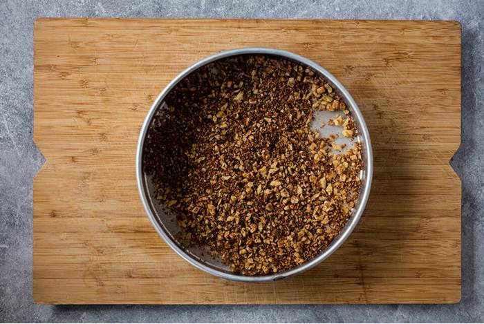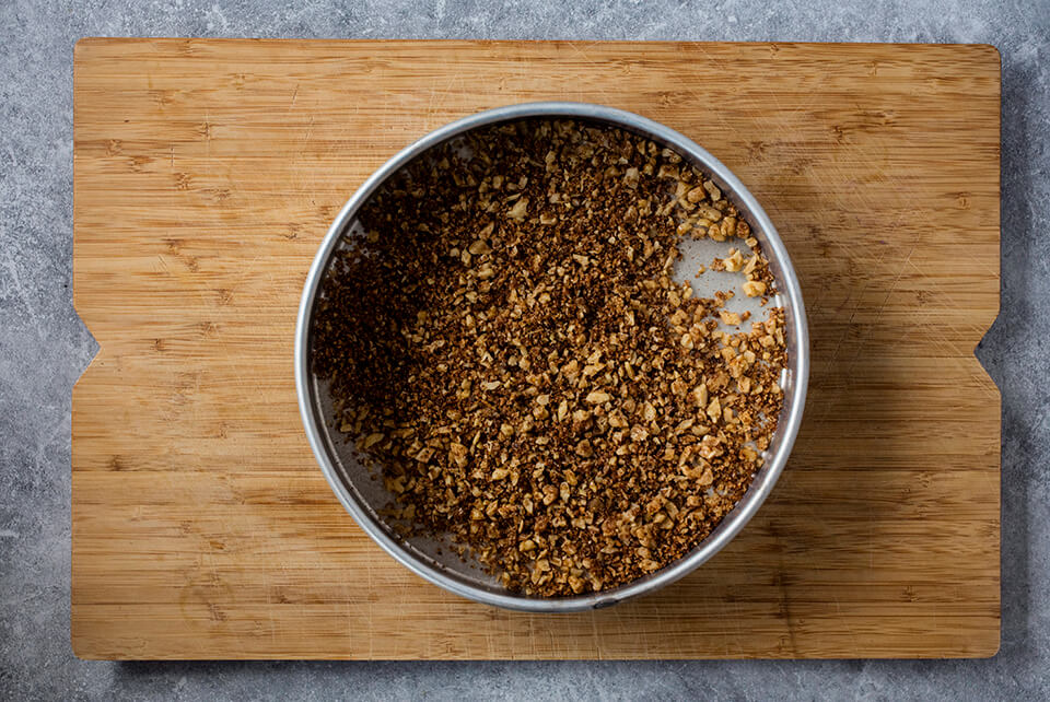 Smelt smøret i en stekepanne, ha i griljermel, hakkede nøtter, kanel og brunt sukker. Brun på middels varme. Vend på brødet hele tiden til det får en lys karamellfarge. Hell blandingen over på et flatt fat og avkjøl.